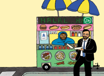 "This playful picture book debut from Von Platen takes inspiration from the 13-mile summer 2025 Manhattan campaign walk of mayoral candidate Zohran Mamdani. As thin-lined, bold-hued illustrations nod to the look of Mamdani’s much-buzzed-about political poster design—a palette that draws from New York City’s visual culture of bodega signs and yellow cabs—the subject affably strolls, cheers, and occasionally boogies through the city, wearing the same slightly rumpled black suit, blue tie, and blue sneakers. Minimalist text refers warmly to 'Zohran’s city' ('In Zohran’s city, there are new things to do at every crosswalk'), but what emerges in this fond portrait is a bustling metropolis that belongs to all. There, 'everyone is always on the move' (Mamdani greets folks beneath an elevated train), but it’s also okay to 'slow down and listen' (he sits on a park bench, sipping from the classic New York coffee cup). Even readers beyond the five boroughs will recognize the figure as someone who loves where he lives and believes that every interaction matters."—Publishers Weekly